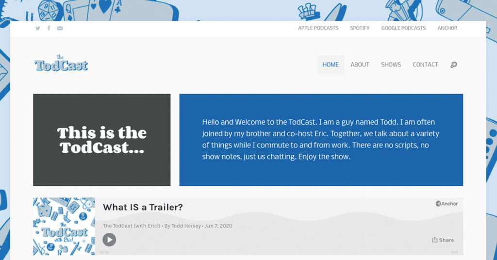Nearly every weekday morning Eric gets on a Skype call with his brother Todd. The TodCast PodCast, now featuring Eric, released nearly 110 episodes in 2020. Eric appeared on all of them except three. Podcasts come out on Wednesdays and Saturdays, with the occasional bonus episode. This year the brothers also launched a new website and various social media channels.